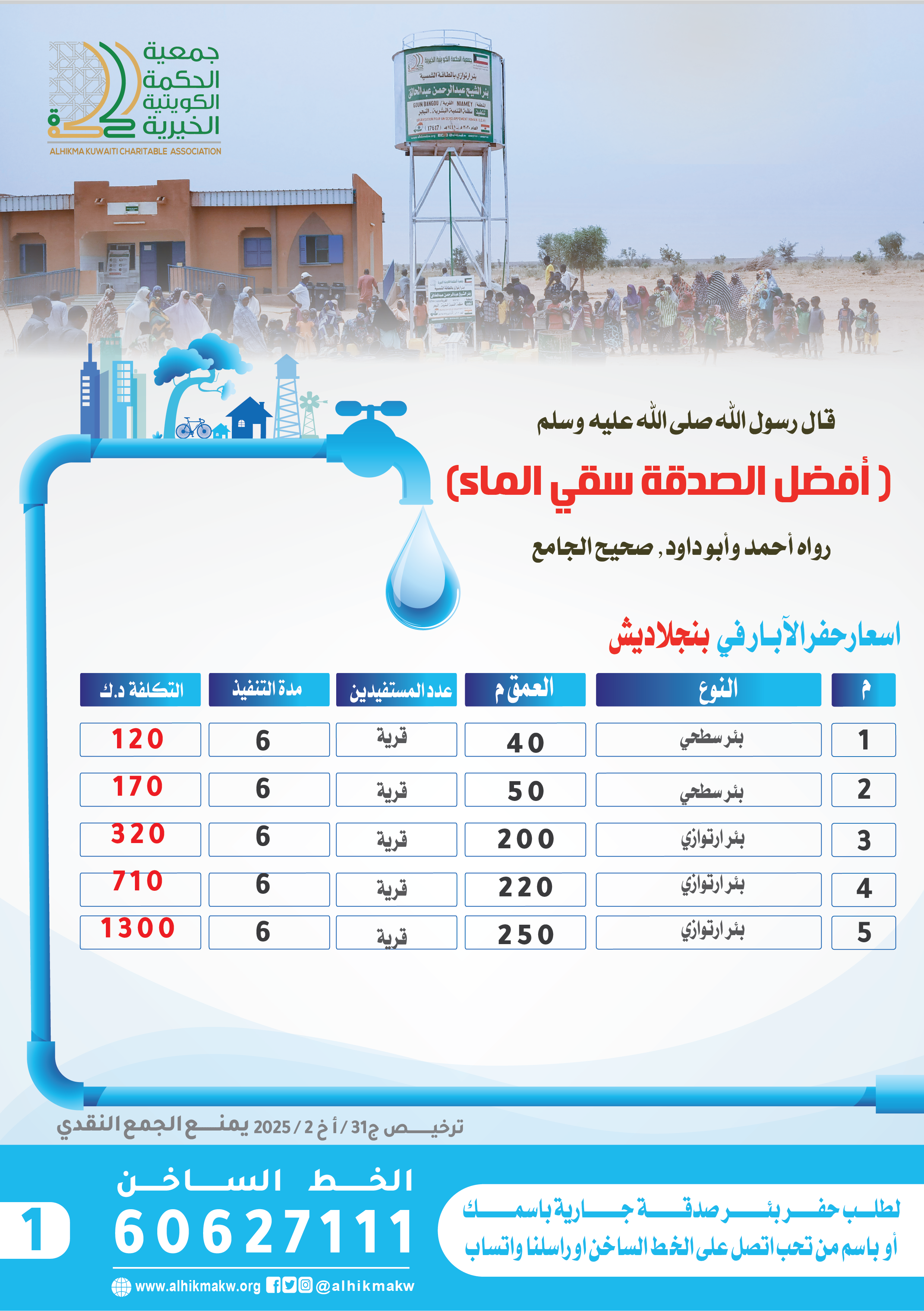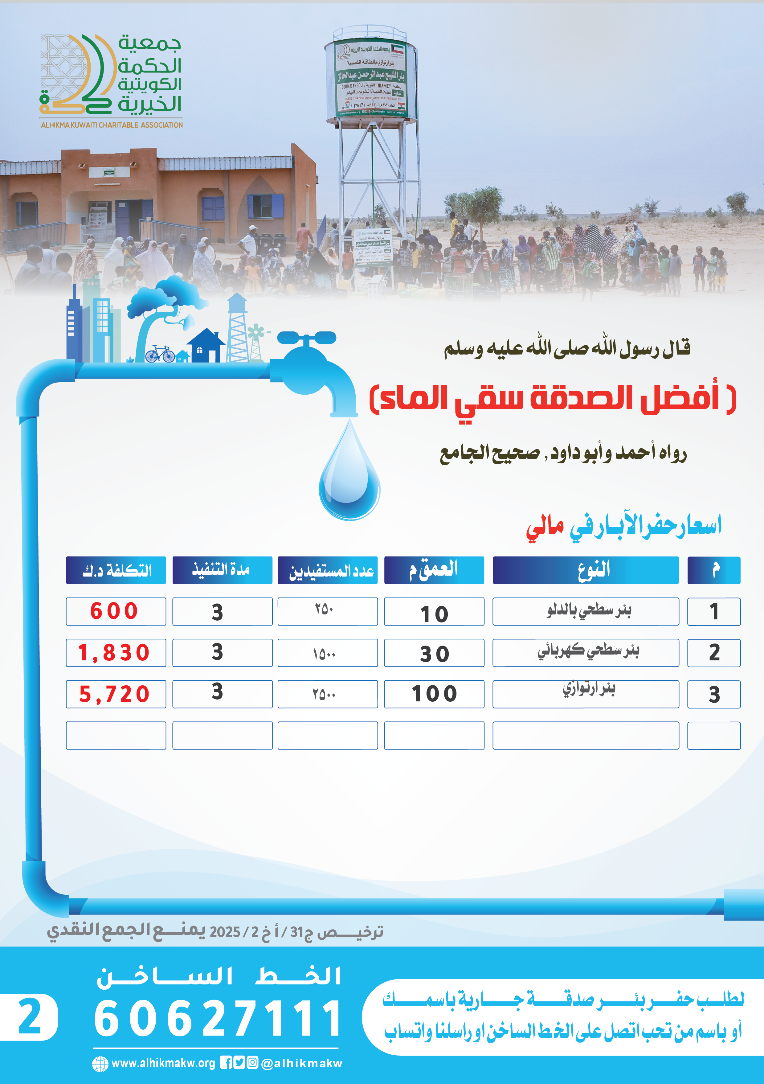 من خلال مشروع حفر الآبار خارج الكويت، تعمل جمعية الحكمة الكويتية الخيرية على توفير آبار سطحية وارتوازية في القرى الأكثر احتياجًا، لتأمين مياه نظيفة وآمنة تُنقذ حياة الأسر وتخفف معاناتهم، وتكون صدقة جارية يمتد أثرها لسنوات.